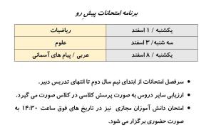 • امتحان دانش آموزان مجازی نیز در تاریخ های فوق ساعت 14:30 به صورت حضوری برگزار می شود.