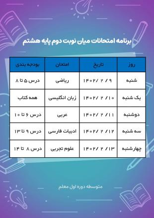 📝 *برنامه امتحانی و بودجه بندی میان نوبت دوم پایه هشتم*